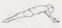ETAPE 3: Sur une expiration soulevez le bassin en poussant sur les mains et les pieds. Le visage parallèle au plafond. Veillez à ce que les épaules, le dos et le bassin et la tête forment une ligne horizontale dans la mesure du possible. Restez dans cette position 5 respirations