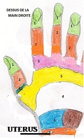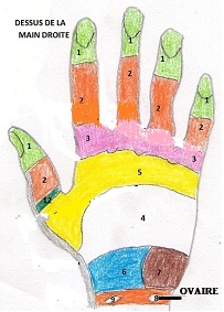 | MAINS : le point de réflexe des OVAIRES se trouve sur le dos de chaque main, (le côté de l’index) près de la poignée à l’intérieur d’une bande étroite. |