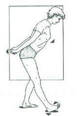 POSITION DU DÉPART: Debout jambes écartées. Fléchissez le buste vers l’avant posez les mains (sans fléchir les coudes) sur un bureau, le dos d’une chaise ou une tableau, le dos bien plat. Inspirez.