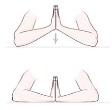 POSITION DU DÉPART :- ÉTAPE 1 : ASSIS à votre bureau METTEZ vos mains en position de prière, les doigts vers le HAUT et les coudes sur le bureau.