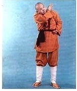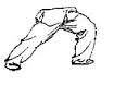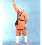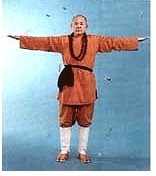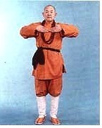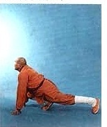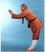 Fléchissez légèrement les genoux. Tournez le talon DROIT vers l’intérieur (la posture de GONG BU, le pas de l’archer. La jambe DROITE à angle DROIT et la jambe GAUCHE tendue). La main DROITE est étendue devant le corps la main GAUCHE étendue vers l’arrière. Repliez tous les phalanges (de l’auriculaire au pouce) de deux mains pour former un poing