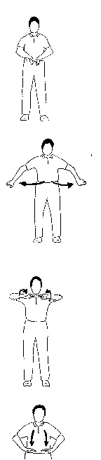 Placez chaque poing fermé sur le flanc au niveau de la taille (les 4 doigts repliés couvrent le pouce) . Ouvrez les doigts de la main DROIT, la paume tourné vers le ciel. Levez la main DROITE à hauteur des yeux en suivant le mouvement des doigts de la main DROITE avec le regard