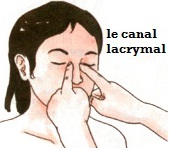 Avec les INDEX pressez de chaque côté du nez (l’emplacement du canal lacrymal): sous l’œil dans le coin intérieur côté nez . Massez au milieu et vers le bas de l’ARÊTE du nez