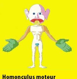 • L’Homonculus (petit Homme en latin) « sensitif » ou « moteur » un terme utilisé par le neurologue PENFIELD représente graphiquement la carte NEURONALE du CORPS PHYSIQUE et il est directement relié par des VOIES NEURONALES à des zones spécifiques du CERVEAU.